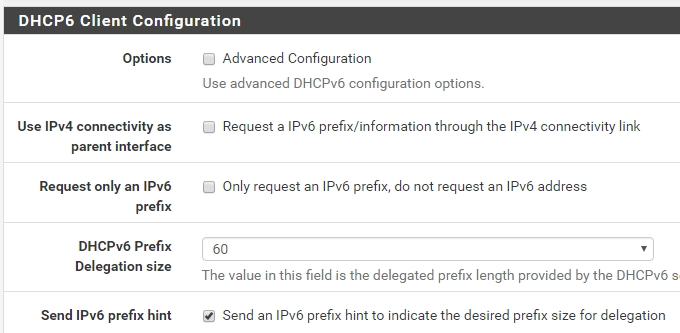 Comcast will let you request no more than a /60. 16 /64 subnets on a personal network should be more than enough for most people. Business class service may be able to request larger allocations, but consumer service can request anything from /64 to /60 only, depending on how many subnets you need (1 to 16, based on number of bits). Because of pfSense's IPv6 implementation with DHCPv6 on the WAN, there is no way to set up a static IPv6 address for your router on your LAN. You set up "Track Interface", "WAN", then select which subnet you want to use (which will only be 0 if you request a /64, could be 0-F if you request a /60). The LAN interface gets a SLAAC address based on the interface's MAC address.